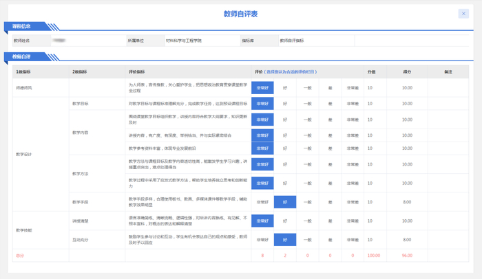 每学期,教师在平台上依据评价指标,对自己所授的课程进行自我评价。评价指标可设置多级,强调教学内容、课堂互动和教学效果,形成教学反思和持续改进。