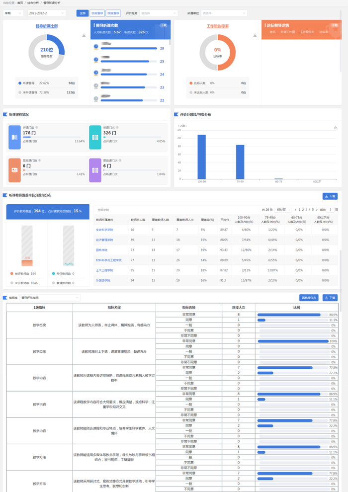 全面涵盖了督导听课分析、领导听课分析、同行听课分析、学生评教分析、随堂评价分析、教师综合分析、教师自评分析、教师评学分析、词云分析等。