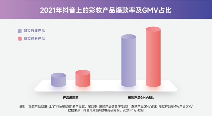 无论是护肤还是彩妆,沟通美妆成分的产品更容易成为爆款产品,且美妆成分爆款产品对GMV的贡献比美妆行业爆款产品更大。