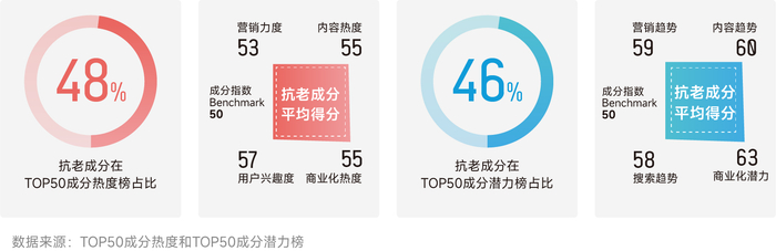抗老成分在TOP50成分热度榜中几乎占据了半壁江山,是目前消费者最看重的功效类型之一。同时抗老成分在TOP50成分潜力榜中的占比也达到46%,潜在挖掘空间很大,展现出不错的趋势和商业化潜力。