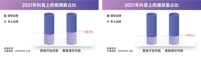 从抖音视频数占比结构看,本土品牌通过成分宣传产品的意愿更强,但从抖音播放量占比结构看,本土品牌在美妆行业内容和美妆成分内容中的占比几乎一致,说明相较于供给,用户对成分故事内容的消费虽也有增长,但潜力仍待释放。如何讲好成分故事,是本土品牌仍需补足的功课。