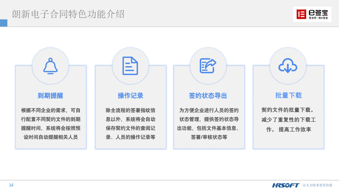 与此同时,e签宝还为朗新天霁还提供了多种特色功能,例如合约到期提醒功能,帮助HR及时与员工续约,规避违规用工风险。还有操作记录自动留存、签约状态实时管理、文件批量下载等功能,大幅提升企业HR部门的工作效率,省心省力。