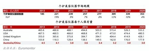 根据Euromonitor数据显示,部分欧美发达国家的人均个护美.容仪器保有量数倍于中国消费人群。以澳大利亚、美国为例,个护美.容仪器每千人人均的保有量是目前国内保有量的3倍,随着中国市场的不断成熟,差距不断缩小,中国个护美.容仪器销售额未来规模有望达千亿级别。