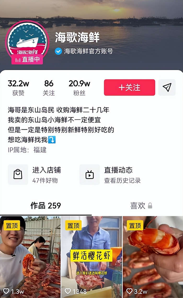 @海歌海鲜是东山岛海鲜品类商家,和上文提到的@刘师傅缝纫用品一样,也是2021年初,公司还处于初创阶段时入驻的入驻巨量千川。在小店随心推的助力下,@海歌海鲜“旗开得胜”:2021年双11期间店铺GMV超200万,2021年双11期间巨量千川ROI达到4+,2021年双11期间粉丝环比增长11.5%,短短一年的时间,就实现了团队规模翻4倍、品牌效益翻10倍的跨越式发展。