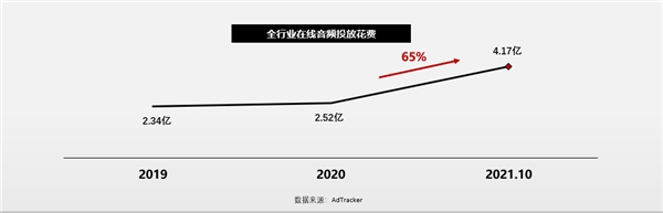 相比传统广播的寒冬,新兴的在线音频行业则春意盎然。截至到2021年10月,在线音频行业“去重”活跃用户规模达7.28亿,同比增长3.8%。媒介花费保持持续稳定增长。