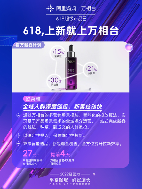 据悉,欧莱雅在此前的38大促中,参加了“百万新客计划”进行全域拉新。在这波合作中,欧莱雅拿出额外15%超百万的预算,最终拉新效率提升1.8倍,拉新成本比同期均值降低9%,部分产品点击成本降低41%,平均ROI高于2.5,而且新客贡献的GMV也占到总GMV贡献的15%。