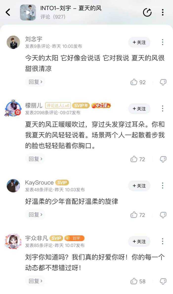 除了《夏天的风》外,INTO1刘宇的《柳叶刀》、《白话文》、《千岁》等歌曲均已上线酷狗音乐,喜欢的歌迷可以去收听。