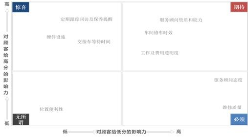 寻根究底,这是因为客户体验的核心就是客户预期和感受之间的差异,差异越大体验越显著。参考卓思对某汽车品牌在服务端的NPS调查结果,有些指标客户会觉得“做好了是应该,做不好则完全无法接受”,因此更容易给出低分;有些指标则恰恰相反,会更容易影响顾客给出高分。所以,如前面提到的奢侈品牌虽然也有各种顾客抱怨,但他们不仅在产品款型、用料上下功夫,即使只谈服务,在门店装修、店员形象、周边产品等方面也都不吝投入。当一个品牌反复、一致地在客户体验上实现其品牌主张时,才会驱动品牌的差异化,赢得客户忠诚,获得商业回报,总结起来就是: