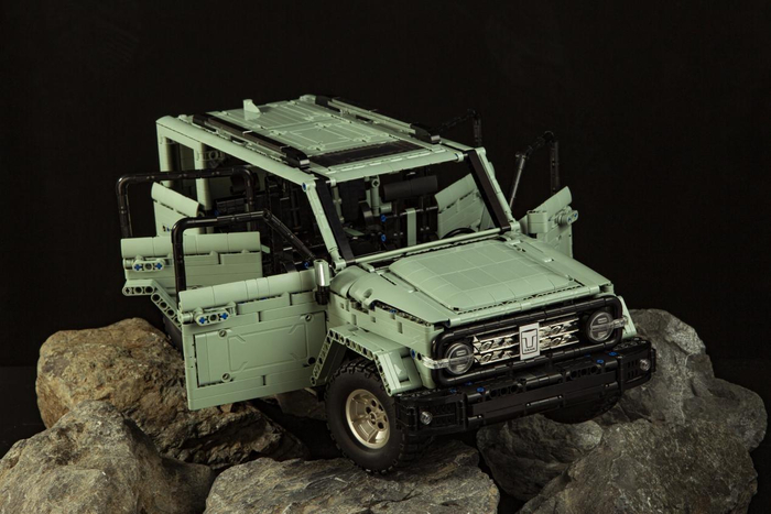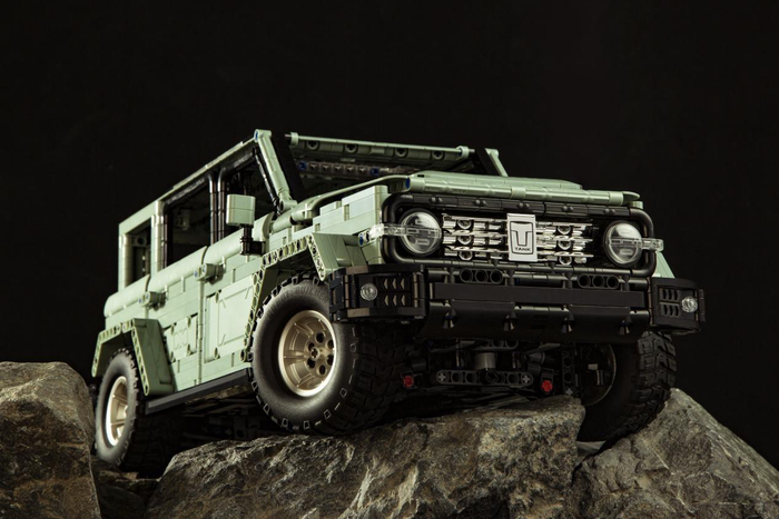 坦克300积木越野车的整体外观设计个性鲜明,采用种草绿的低保和高级配色,方圆有度的造型十分打动人心。远观可见大气方形车身搭配硬朗线条,浑然一体车灯设计使人眼前一亮,圆形车灯呈现经典复古之美,车尾搭配全尺寸备胎,配有和原车一样的竖条尾灯,后车门带有真实门锁机关,车身内部精致还原内饰,双排座椅均可放倒,引擎盖配有支撑,积木呈现整车的精致细节,致敬经典的同时也有自己的血液。