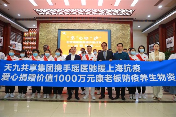 在4月25日的北京瑶医援沪医疗队出征仪式暨天九共享爱心捐赠仪式上,天九共享电商集团高级副总裁张鹤表示:“瑶医援沪,我们全力助阵。京沪一家亲,作为一家北京企业,助力上海抗疫攻坚,是我们应尽的责任。天九共享集团决定向瑶医援沪医疗队共捐赠价值1000万元的‘康老板’防疫养生物资,助力瑶医援沪抗疫,为抗疫工作贡献一份力量。”