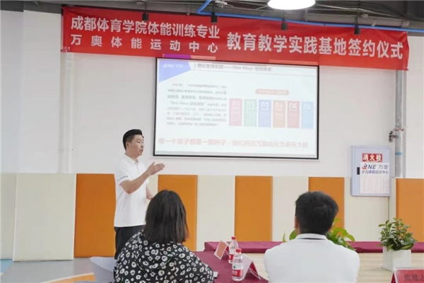 2022年5月10日,成都体育学院体能训练专业国内首个儿童体适能领域教育教学实践基地在万奥体育完成签约授牌仪式。成都体育学院体能训练专业熊维志书记、涂晏豪主任、万奥体育创始人王义 等相关领导出席了本次授牌仪式。