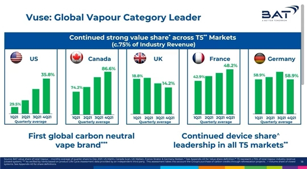 VUSE在全球市场的表现日益持续获得认可。2019年,BAT首席执行官杰克鲍尔斯表示,英美烟草将把其“新品类”业务精简为三个主要品牌:雾化电子烟VUSE、尼古丁袋VELO和加热不燃烧GLO。