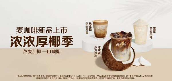 近日,麦当劳旗下手工咖啡品牌麦咖啡推出全新“浓浓厚椰季”系列:燕麦厚椰热拿铁、燕麦厚椰冰拿铁、燕麦厚椰雪冰。新品加入了国货椰基植物奶领导品牌菲诺的厚椰乳以及OATLY噢麦力燕麦奶混合而成的燕麦厚椰乳。5月11日起,麦咖啡门店和麦咖啡小程序同步上新。