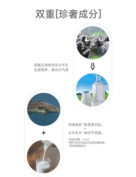 一口小仙气胶原蛋白肽水牛乳,含有采用纯正鱼皮为原料的胶原蛋白肽,动物蛋白肽与人类蛋白结构相似,更易吸收;每100克含有30毫克胶原蛋白肽,制备缺失胶原蛋白、辅助胶原再生,源头激活肌底合成胶原能力。胶原蛋白肽+水牛乳蛋白,双重补充。