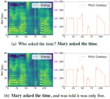 图3:文本转语音新算法CUC-VAE生成的“Mary asked the time”的能量分布和音高升降曲线,更自然地区分出不同的前后语句环境