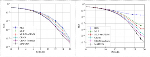 图7:基于MAFENN框架的智能均衡器(黑色)在线性(左)和非线性(右)无线信道情况下都能够有效降低系统的符号误码率