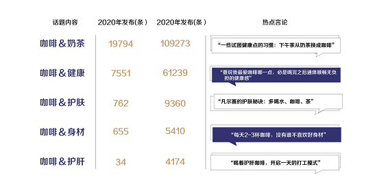 · 2020年-2021年,咖啡与健康相关话题在「微博」讨论量快速增长,#新研究称喝咖啡有助保护肝脏#微博话题阅读量高达1.7亿。
