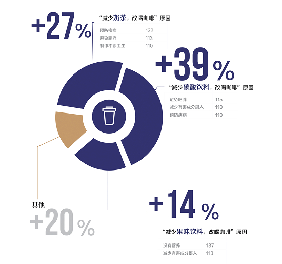 · 调研数据显示,咖啡健康价值普及会提升咖啡消费量。其中,增加的部分有39%源自碳酸饮料消费减少,27%源自奶茶消费的减少。