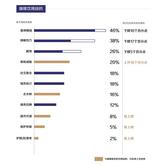 · 提神醒脑、排解压力依然是用户购买咖啡的主要原因;帮助减脂、提升代谢、保护肝脏等咖啡健康功能开始得到国内消费者关注,成为咖啡消费的新驱动因素。
