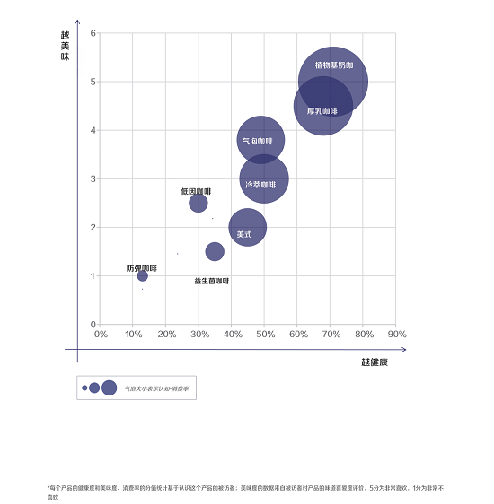 咖啡的健康认知度与果汁几乎持平;奶茶依旧被认为“不够健康”