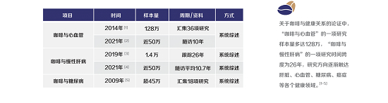 · 关于咖啡与各种健康维度的正向关系研究中,共同特征是“样本量大、周期长,标准高”,并且经过常年延续与累积,研究结果的权威性与可信度不断强化。
