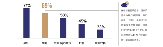 · 主流饮品中,咖啡健康认知明显提升,国民认可度达到69%,与果汁类饮品基本持平。奶茶、碳酸饮料等被认为不够具有健康价值。