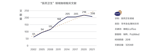 · 据不完全统计,2002年-2021年,国内外关于咖啡与医药卫生关系的研究文献量持续增加,2021年为2002年三倍多。