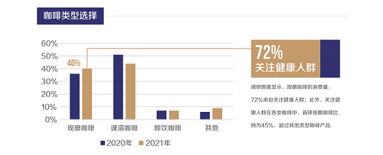 · 调研数据显示,相比2020年初,2021年选择现磨咖啡的用户比例明显提升,达到40%,其中关注健康人群更成为现磨咖啡的消费主力军。
