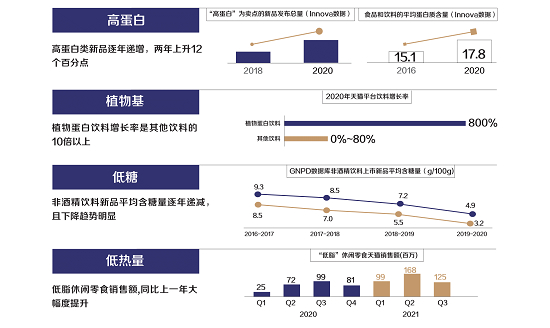· 随着国民健康意识全面觉醒,2021年,“健康饮食”成为最受关注的健康行为之一。受访者中,79%表示比以往更注重饮食的健康价值。健康饮品进一步受到国民追捧,主打高蛋白、植物基、低糖、低热量的新品成为新发展方向。