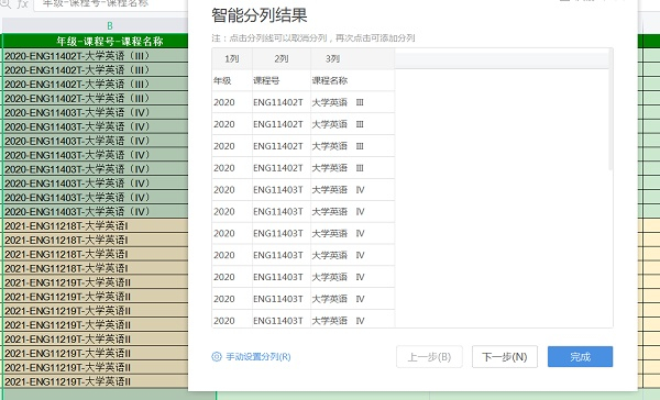智能办公的引入提供了新的思路。成明时介绍到,在处理数据时,运用WPS的「数据对比」功能,可以快速标记甚至直接提取出同一工作表或者多个工作表中的重复数据或者唯一数据;其中最便捷的就是,它可以一键直接将需要的数据整理出来成为新的一页工作表,使得在多个上千条目的表格数据中快速、精准的找到自己需要的数据,变成了一件非常简单的工作;在给各学院制作考表时,通过「智能分列」功能,还可以很快地将一列复杂的数据分类为:年级、课程代码、课程名称。