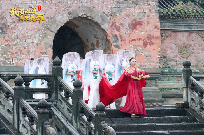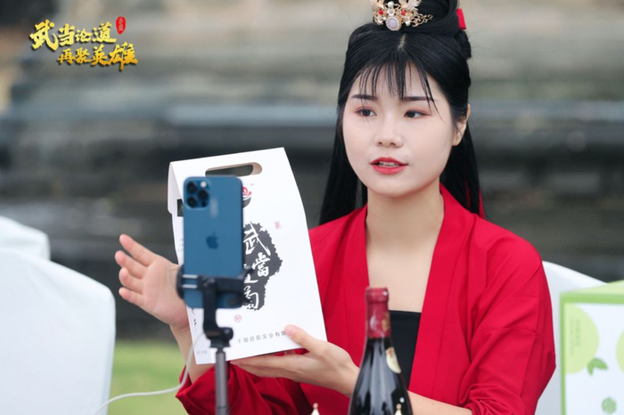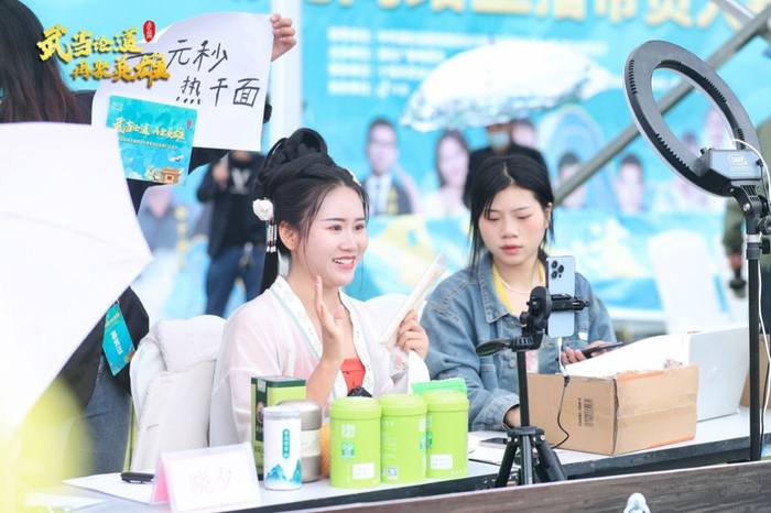 5月14上午,在武当山玉虚宫广场,从千名主播中脱颖而出的优秀主播和店播,一袭古风华服,化身“种草机”,发出带货湖北最强音。当天直播带货的内容以湖北特色美食为主,包括热干面、藕带、绿茶、粽子等30种湖北特产 。
