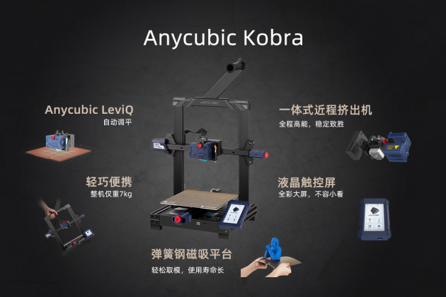 Anycubic Kobra是一款熔融沉积成型技术(FDM)3D打印机,外观灵感采用模块化设计理念,以黑色为主色调,搭配藏蓝和中国红,简约而不失科技感。因其功能强大、轻巧易置,且搭载“Anycubic LeviQ”自动调平系统和一体式近程挤出机,被海外3D行业权威媒体网站认证为千元级优选3D打印产品。