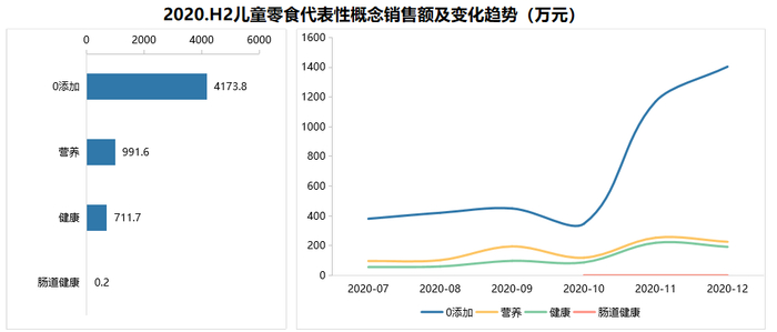 这张图是2020年下半年重点线上平台儿童零食重点概念销售情况,消费者认可度最高的概念是“0添加”。