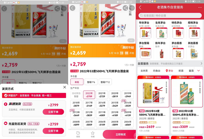 一个最为简单的例子是,如何在阿里资产抢到价格最合适的飞天茅台?消费者只需要在阿里拍卖内直接搜索“飞天茅台”,可以发现带自营字样显示的均是低至1499元和2489元最低价格飞天茅台,消费者只需按照相关活动时间抢购即可,无需再次进行比对。