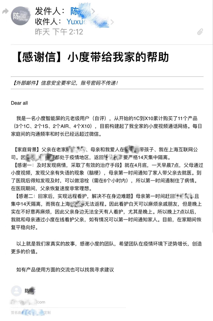 日前,小度就公布了这样一封来自忠实用户的感谢信。