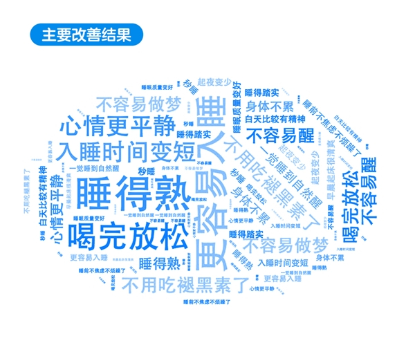 本次调研活动中,三只小牛也为1000名“试睡员”提供了能舒缓安神的功能牛奶产品「睡前30分」,其中每包牛奶添加有307mg天然成分GABA(γ-氨基丁酸)。牛奶本身富含色氨酸,可以调整大脑的神经递质,加入GABA后更能舒缓神经。收到三只小牛睡前30分牛奶后,有80%的饮用者在饮用一段时间后表示对睡眠障碍改善具有一定的效果。受访者感受到最明显的改善是“入睡更快、易醒得到改善以及睡眠质量变好”。