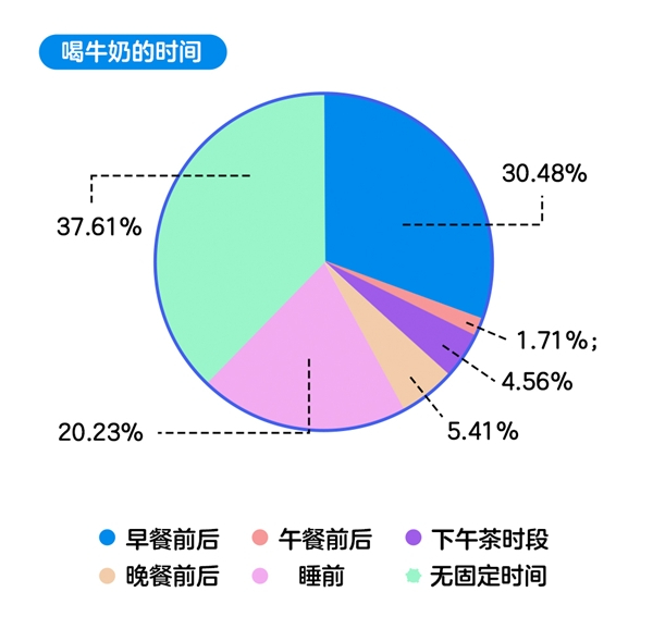 失眠人群对牛奶普遍持友好态度,但尚未完全养成坚持饮奶的好习惯。超过9成人群会在日常生活中补充牛奶,坚持饮用一年以上的人群只有59%,刚过半数。选择饮奶的时段上,大多选择在早餐前后饮用,也有20.3%的人选择睡前饮用,已有相当一部分人认同睡前喝牛奶对睡眠有益。