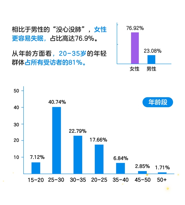 睡眠问题已经不属于某类特定人群,各行各业、从小到老都开始更加注重睡眠。相比于男性的“没心没肺”,女性“心事压抑”更容易失眠,占比高达76.9%,面对倒头就睡的老公/男朋友,不由心生羡慕。从年龄方面看,20-35岁的年轻群体占所有受访者的81%,作为社会的中流砥柱,在“早晨靠咖啡续命,深夜对天花板叹气”的循环中,睡眠状况日渐恶化。