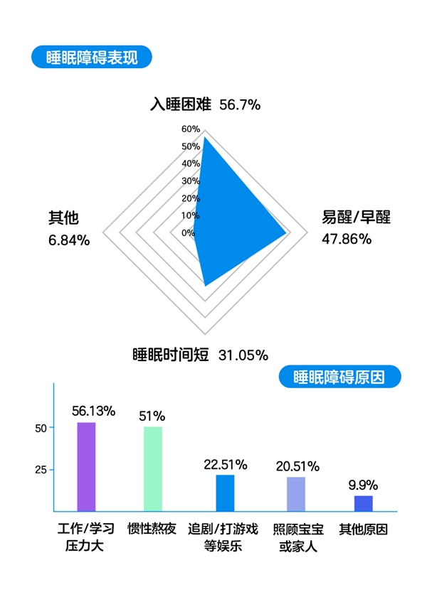 睡眠障碍的主要现象则是入睡困难和易醒早醒,分别占据56.7%和47.86%。