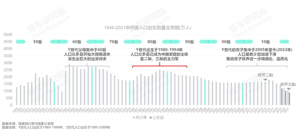 截至2022年一季度,年龄最大的Y世代已迈过40岁,最小的也超过了25岁,由“夜店时代”整体过渡至“柴米油盐酱时代”,摇身一变为中国家庭的主体,还承担着生育二胎、三胎之艰巨而神圣的革命任务。再加Y世代人口众多,势必会滋生出更多的家庭自驾游等新购车诉求;Y世代的父母集中于60后,该群体同样人口众多,且开始大规模退休,势必会滋生出大量独立的或由Y世代陪伴的自驾游等新购车诉求;Y世代的孩子集中于2005年至今(2022年),该群体人口基数少且加速下滑,推动Y世代的抚养进一步精细化、品质化,势必会滋生出更多家庭自驾游等新购车消费;