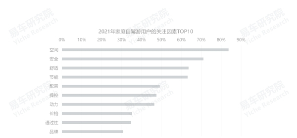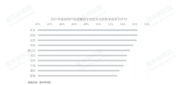 2021年家庭自驾游用户的主要关注因素为空间、安全、舒适、能耗等,同时,在自驾游车市的关注因素渗透率排行中,安全、舒适、节能等同样排名靠前,品质有了大幅提升;