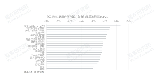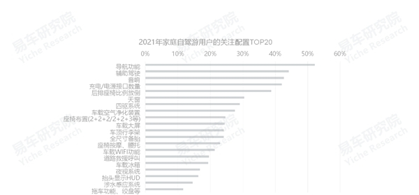 2021年,家庭自驾游用户更关注导航、辅助驾驶、充电口、座椅调整等配置。从自驾游车市的各大配置的渗透看,中间留有过道的2+2+2等座椅布局,最能吸引家庭自驾游用户,其次是空气净化、充电口、夜视系统与车载WIFI等;