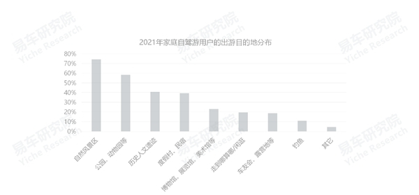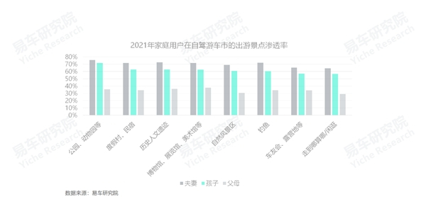 2021年,家庭自驾游用户的出游目的地以自然景区、公园为主,从渗透率看,公园、动物园同样比较显著;