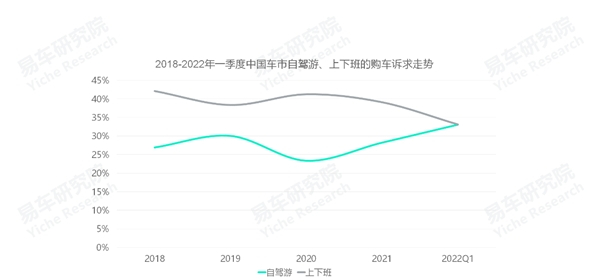 2020-2022年一季度,中国车市的自驾游购车诉求开始触底反弹,由23.34%升至33.03%,快速逼近过去一直位居第一购车诉求的上下班;