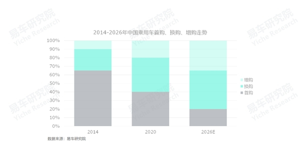 近三四年兴起的“存量之争”并非空穴来风:2014年中国车市的增换购占比仅有35%,多数用户是首购,且以结婚购车为主,其中Y世代是主体。Y世代出生于改革开放后中国经济蒸蒸日上与家庭财富快速提升的新时代,且人数众多与首次购车为主,引爆了结婚购车潮;2020年增换购占比快速升至60%,与之对应的是适合首购的紧凑型轿车等加速萎缩,适合增换购的中型SUV、中大型SUV和微型轿车等加速扩张,代步、自驾游等新购车诉求快速崛起;未来五六年增换购占比将持续增加,车市将更加多元化;