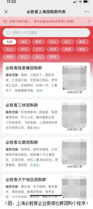此次由必胜客开发使用的“企业微信社群团购小程序”,用企业微信群来承接超负荷的微信群。运用原先沉淀的企业微信流量,有效盘活转化,自动裂变成更多的小区团购群,让每一个小区团长都能进入到相应的团购群下单。