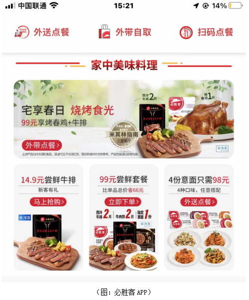 早在2020年2月底,必胜客通过外送外带在4个城市试点了“在家吃大餐”的零售场景,主推“原肉整块现切,不做拼接肉”的生鲜牛排,以及“100%杜兰小麦制作的进口意大利面”等高品质、高性价比产品,并在短短半年里在全国范围内铺开。无需洗菜切菜烹调,只需简单加工就能轻松享受美味佳肴,抓住众多消费者的胃。今年,必胜客携手法国星级主厨倾力打造更多餐厅级品质产品,进一步拓展产品线,涵盖高蛋白健康肉类如肋眼牛排、高品质面饭类,经典西式大菜以及美味小食等一系列产品,为居家消费人群提供安心美味又容易上手的解决方案。