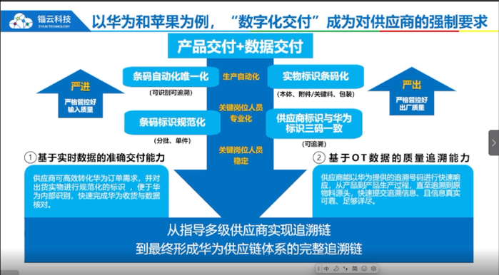 作为开场嘉宾,张澄宇从“全球供应链发生了什么深刻的变化”、“中国制造的战略机遇是什么”切入,表示数字化交付正驱动供应链变革,端企业对于供应链提出了更高的要求成为趋势——实时数据的准确交付能力和OT数据的质量追溯能力。