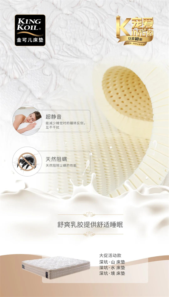 “King的宠爱Ⅲ”恰逢春夏季过渡,而换季对睡眠的影响,是长期睡眠质量欠佳者有口难言的痛,所以睡眠对于健康的重要性,不必多说。金可儿本次活动落实的三大“以旧抢新”政策,狠抓痛点,深得消费者的满意。