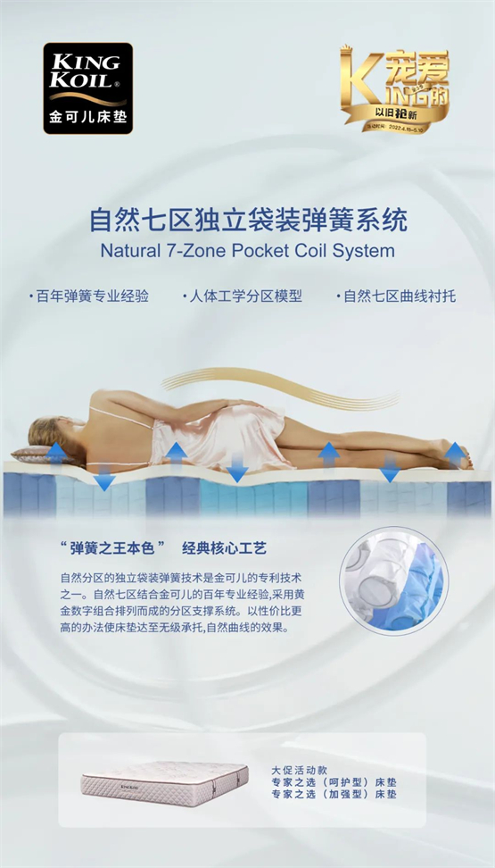 作为目前当之无愧的护脊床垫引领者。金可儿不仅得到专业医学界的高度认可,还自主研发了多项技术专利。此次“KING的宠爱Ⅲ”,金可儿以百年护脊积淀,分别从各大系列中挑选了六样活动爆款,以满足本次活动至上而下的消费需求。